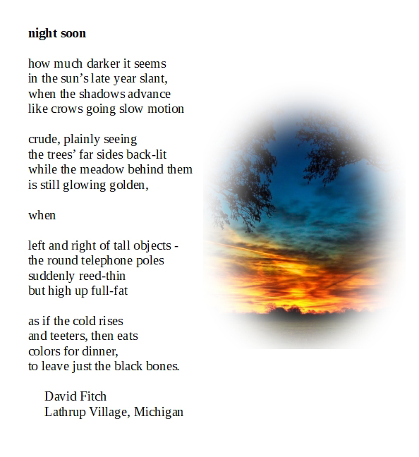 This year’s winning poem in the category “Evening” from the annual contest issue of Peninsula Poets, the journal of the Poetry Society of Michigan.