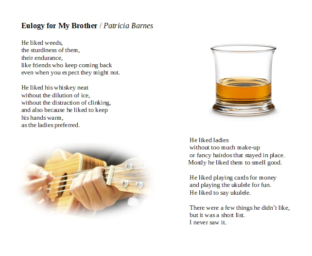 Eulogistic poems don’t have to mournful, somber or depressing. This poem took first place in the category, Loss, in the Poetry Society of Michigan’s annual contest. Patricia Barnes is from Wyandotte, Michigan.