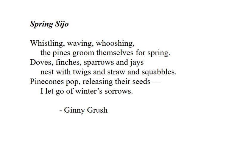 Ginny responded to our March craft article on writing Korean Sijo poetry with this excellent example. We thank her for sharing. Got a good one to share? Send it to our webmaster, Dave Jibson at the address at About/Board of Directors