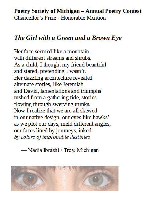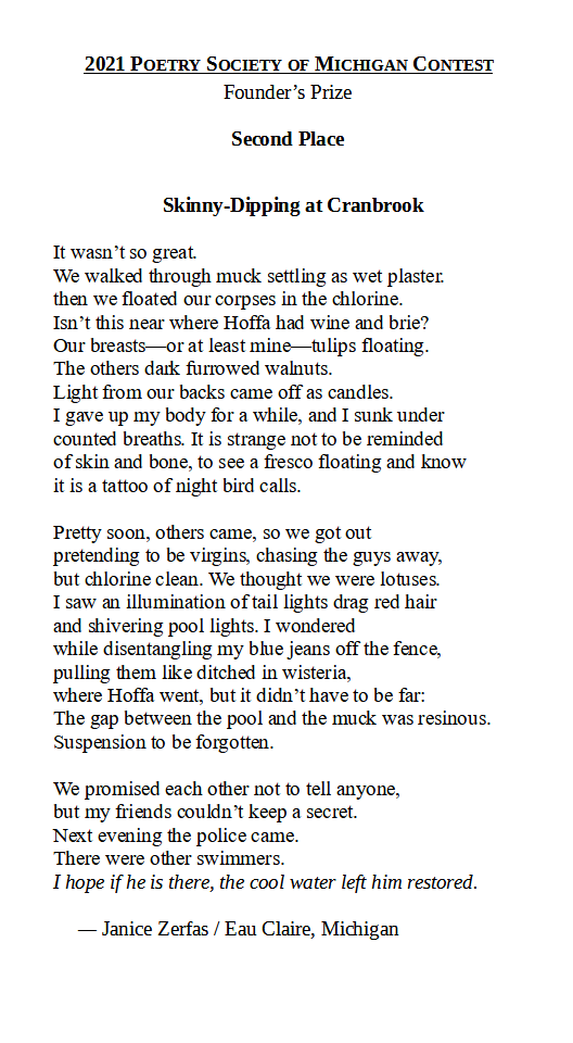 Another prize winning poem from The Poetry Society of Michigan Annual Poetry Contest, this one from the “Love” category.