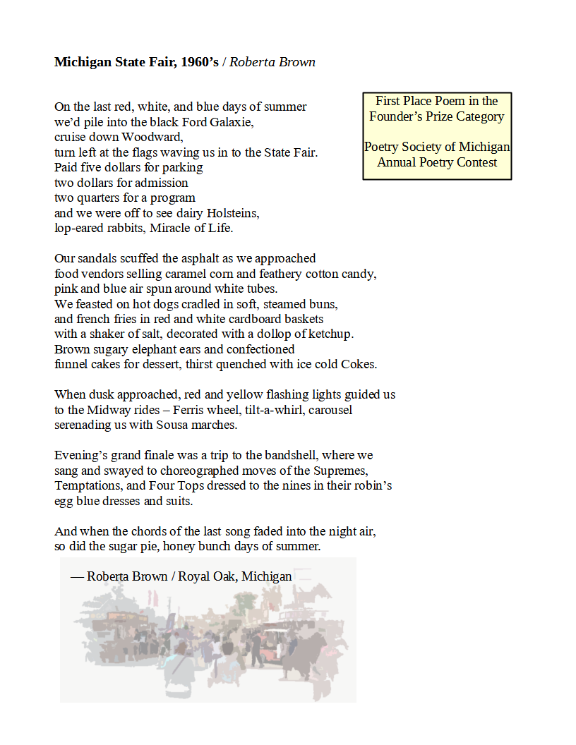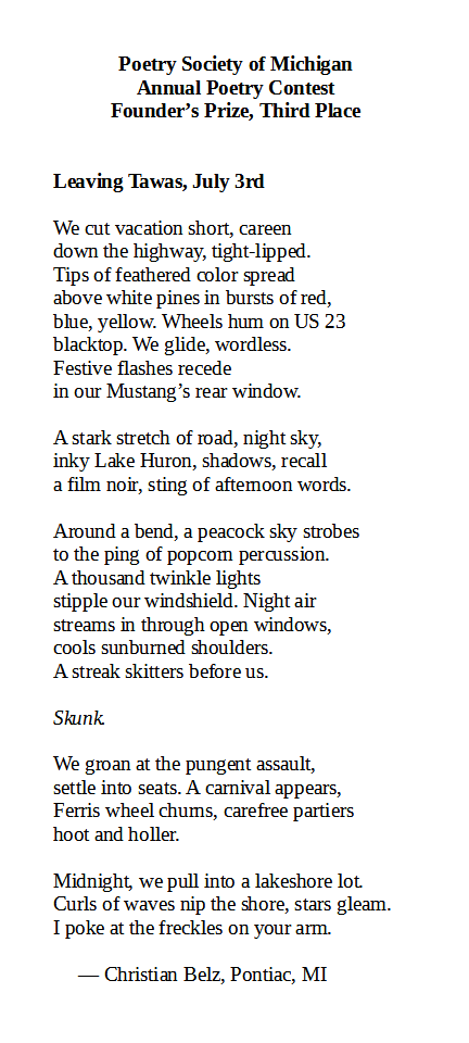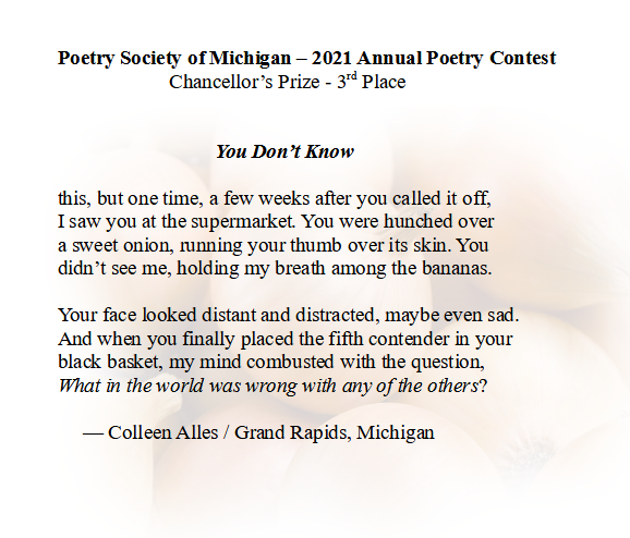 Another prize winning poem from The Poetry Society of Michigan Annual Poetry Contest, this one from the “Love” category.