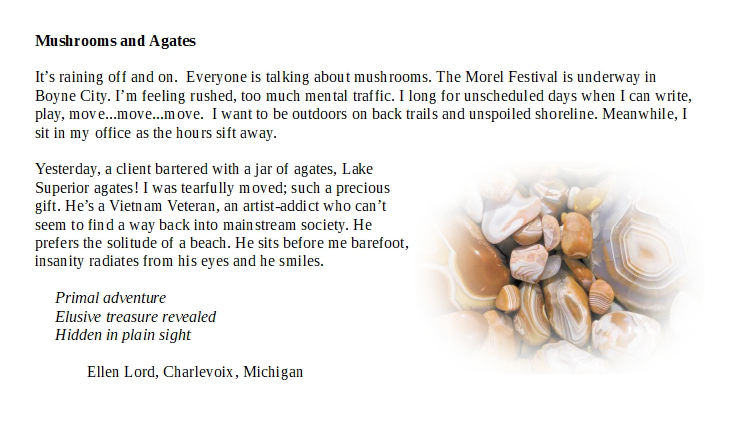 The fall issue of Peninsula Poets is the contest edition. The winner of this year’s Founder’s Prize is a Haibun* from Charlevoix poet, Ellen Lord..