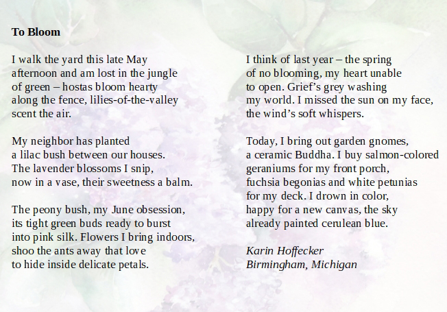 The winning poem in the Nature category of The Poetry Society of Michigan’s 2019 contest is Too Bloom by Michigan poet, Karin Hoffecker. The fall issue of Peninsula Poets in which this year’s winners appear is now available for purchase.