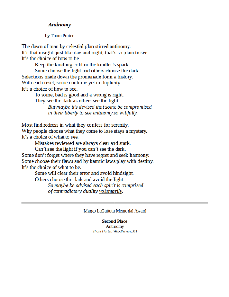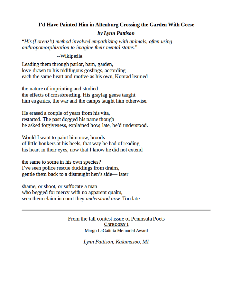 One of Chancellor’s prize winning poems from the fall contest issue of Peninsula Poets by Nancy Cook of St. Paul, Minnesota.